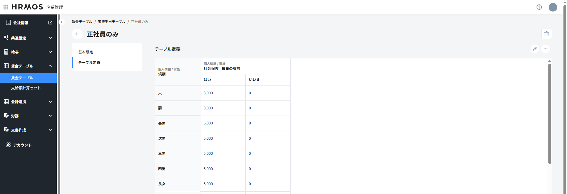 - 対象家族=〇円ではなく、該当家族が1名の場合5000円、2名の場合8000円などの場合はHRMOS COREに「家族手当対象人数」のようなカスタム項目を作成の上、対応ください。