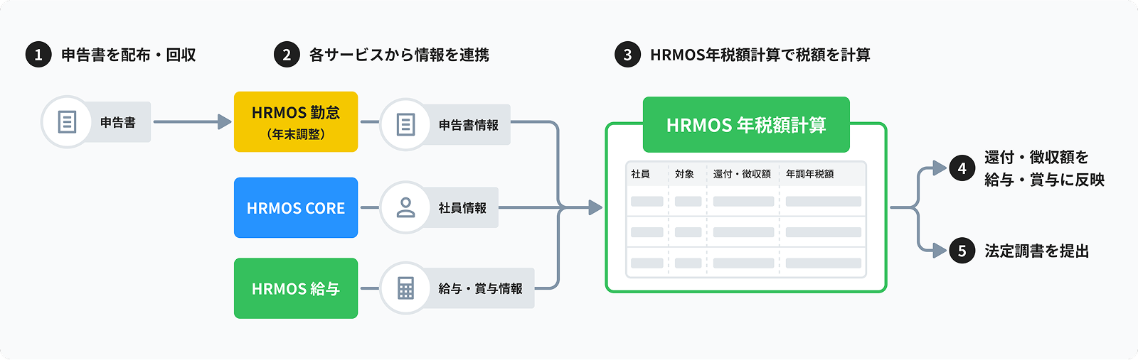 HRMOS COREの社員情報、従業員から回収した申告情報、HRMOS 給与に登録されている給与・賞与データ等をHRMOS 年税額計算に連携させ、最終的な年税額を計算・確定させます。