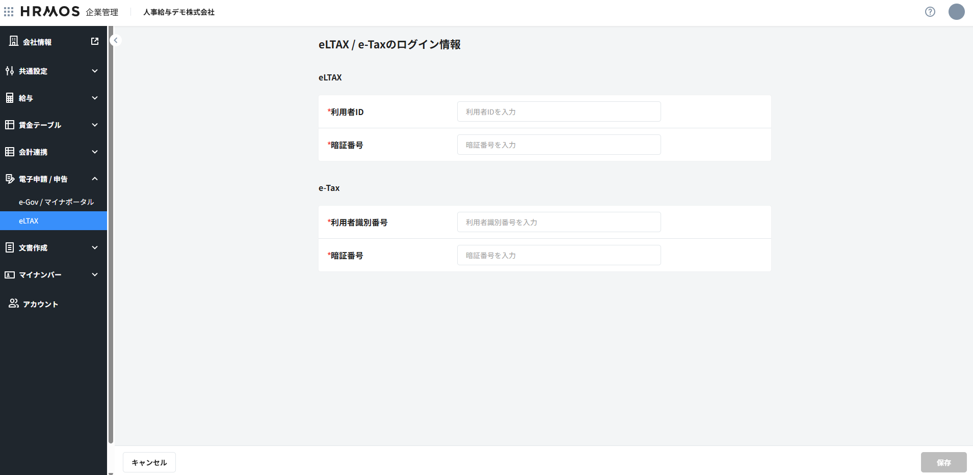 2.ログイン情報を入力をクリックします。eLTAX、e-TAXそれぞれ利用者IDと暗証番号を入力の上、画面右下の保存をクリックします。