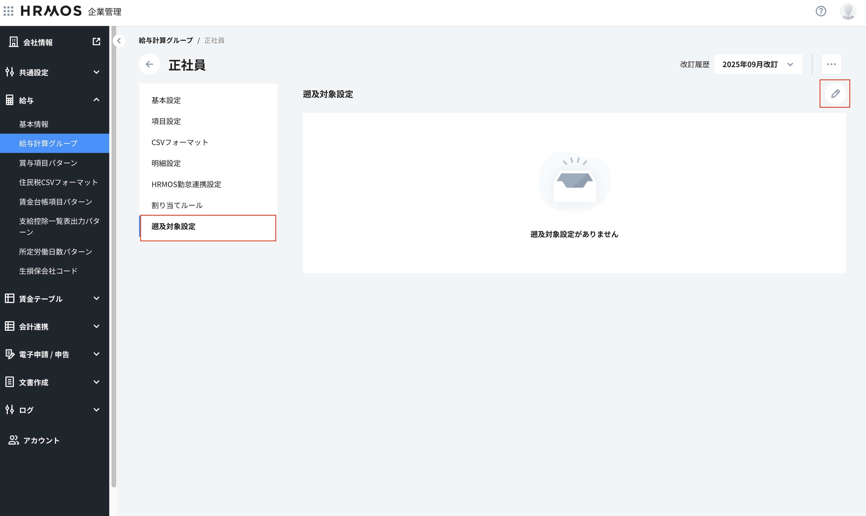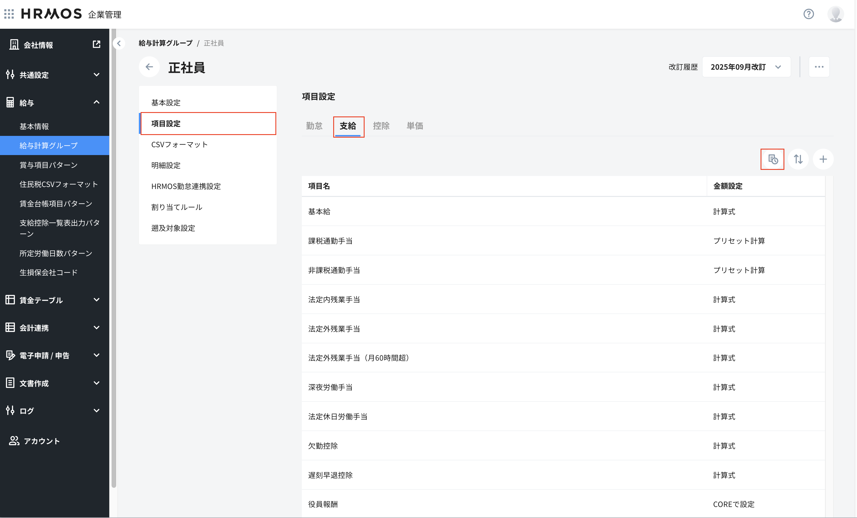 HRMOS企業管理>給与>給与計算グループで遡及計算を行う対象項目を予め遡及対象項目として設定します。