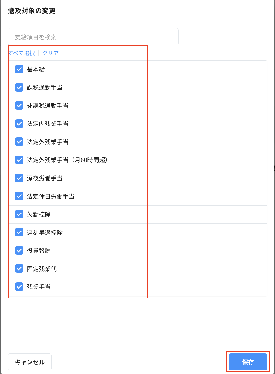 ・遡及して計算をする支給項目を全てチェックし、画面右下の保存をクリックします。
