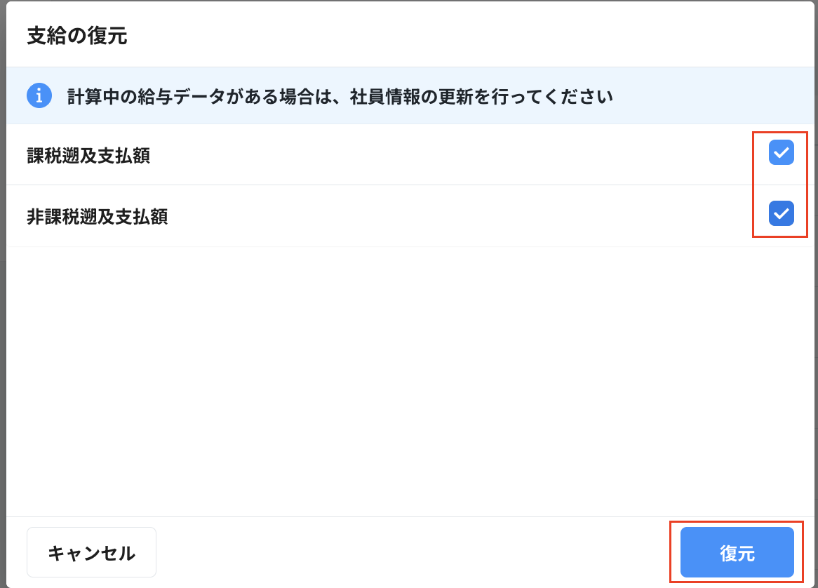 ・必要な項目にチェックをつけ、復元をクリックします。
