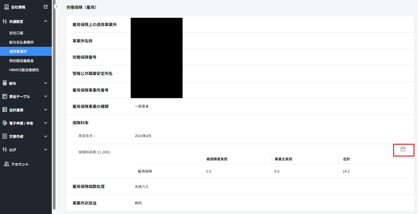 - HRMOS企業管理>共通設定>適用事業所より雇用保険料率が確認できます。